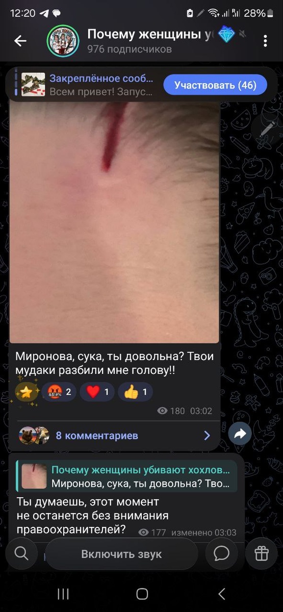 , поступали угрозы в адрес Аксиньи и автора канала. ТЮМЕНСКОЕ ПРАВОСУДИЕ. Вчера вечером на неё напали неизвестные в месте, где нет камер наблюдений. Пишут, что угрозы были неоднократными. Всё из-за расследования причастности Анастасии Мироновой к пропаже детей. Вчера я создала резонанс по этой дамочке из-за оскорбления военных, сегодня она уже перевела свой канал в частный режим и сделала запрет на скриншоты и репосты её шизофренических текстов, клеветы и оскорблений военных. Вот и думайте. В каком мире мы живём, когда девушка, ветеран СВО, жена погибшего героя больше не может безопасно существовать в своём же городе. 😡😡😡 Мы очень надеемся, что правоохранительные органы в этот раз глянут глубже и найдут и исполнителей, и их заказчиков. Потому что это уже переходит все возможные границы!😡😡😡 🔽Подписывайся! 📱 МУРЧЕЛЛО КРЕМЛЯ