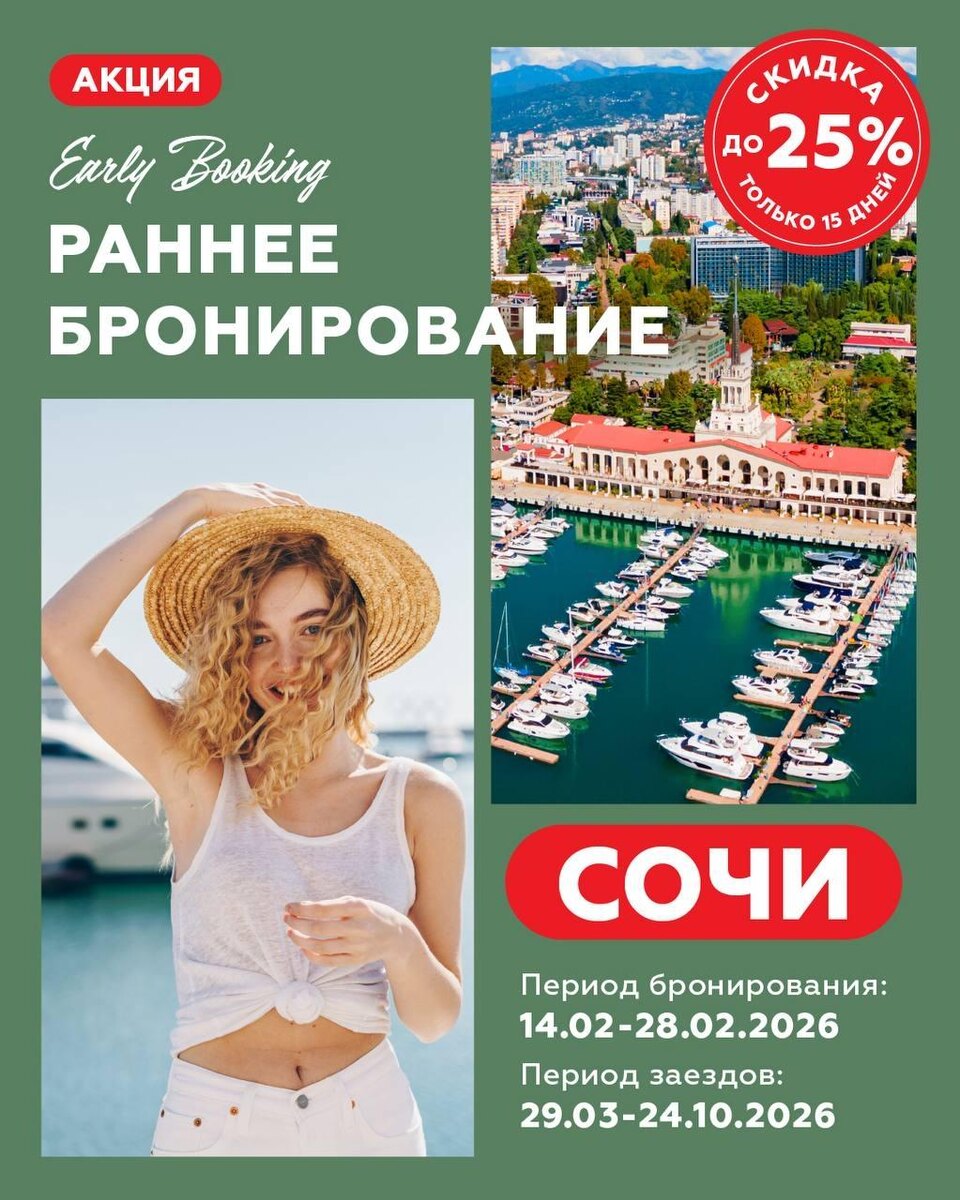 Скидка до 25%! ❗️Дорогие друзья! Только 15 дней скидка на туры до 25% по акции «Раннее бронирование»! 🛫Направления: Сочи, Абхазия ➡Период бронирования: 14.02.26 - 28.02.2026 〰Период заездов: 29.03.26 - 24.10.2026 Подробнее по телефону 2800848(89130300848 МАХ, телеграм)