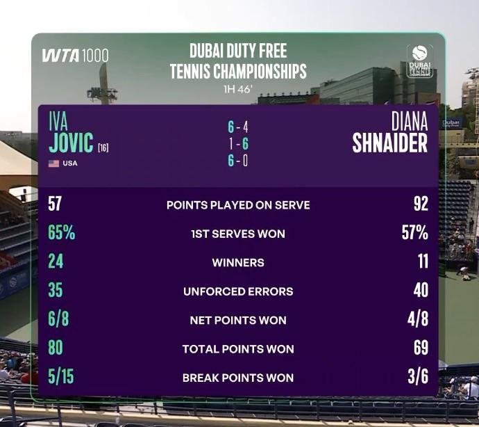 WTA 1000 Dubai R2: И. Йович победила Д. Шнайдер со счетом 6-4, 1-6, 6-0.