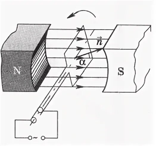 При вращении рамки в магнитном поле в ней индуктируется электродвижущая сила (ЭДС). В зависимости от положения рамки изменяется значение и направление ЭДС. Изменения ЭДС происходят по синусоидальному закону. Величина ЭДС в рассматриваемый момент времени называется мгновенным значением и обозначается малой буквой е. Наибольшее (максимальное) значение ЭДС - амплитуда Еm. Период Т - это время за которое рамка сделает один оборот (360°). Количество периодов в секунду - частота f. f = 1/T Электрический ток, возникающий под действием ЭДС, которая изменяется по синусоидальному закону, также носит синусоидальный характер. Промышленная частота переменного тока в России 50 Гц. Период Т = 1/f = 1/50 = 0,02 c. В цепи переменного тока с активным сопротивлением R, кривые напряжения и тока идут согласованно, т.е. ток и напряжение совпадают по фазе. В каждый период ток протекает полпериода в одном направлении и полпериода в другом. Среднее значение тока за период всегда равно нулю. В цепи переме