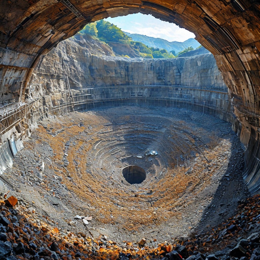Раскопка каверны диаметром 69 м и высотой 94 м для детектора Hyper-Kamiokande