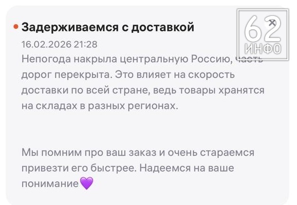 Покупатели из Рязани, сделавшие заказы на торговой онлайн-площадке, получили сообщения о возможных задержках товаров из-за снегопадов. "Задерживаемся с доставкой. Непогода накрыла центральную Россию, часть дорог перекрыта. Это влияет на скорость доставки по всей