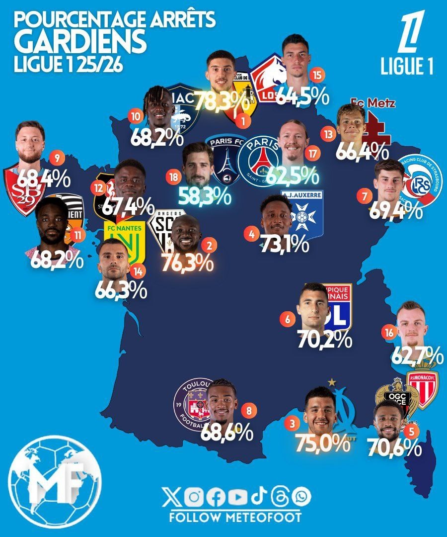 Процент отражённых ударов вратарей команд Лиги1!