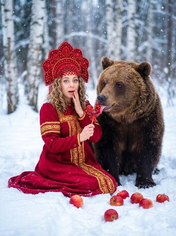 Промпт: Fantasy photography of a beautiful pale woman sitting in the snow next to a huge friendly brown bear. She is wearing a luxurious red traditional Russian dress (boyar style) with gold embroidery and a large red beaded Kokoshnik headdress. She holds a red rooster-shaped lollipop (cockerel hard candy) which the bear is gently licking. She looks surprised, hand near face. Foreground: scattered red apples on white snow. Background: winter birch forest, falling snowflakes, bokeh. Magical atmosphere, vibrant colors, cinematic lighting, highly detailed, 8k. Банк промтов | Твои идеи