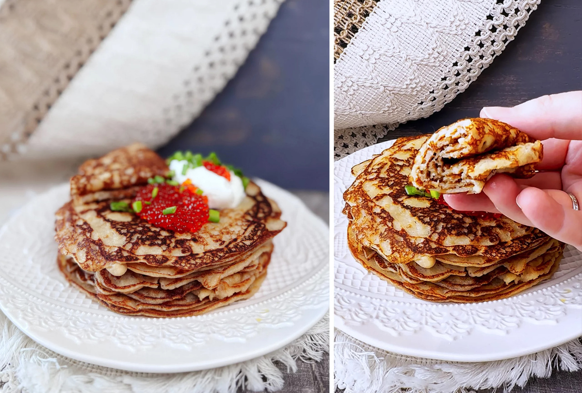 Казалось бы, чем-чем, но блинами нас не удивишь. И рецептов их несметное количество. Несмотря на это, я все равно неустанно ищу новые рецепты, чтобы порадовать вас. На этот раз решила углубиться в историю и приготовить “Царские” блины на гречишной муке 1916 года от Пелагеи Александровой-Игнатьевой. Они воздушные, пористые, яркие на вкус. Единственный минус – делать их достаточно долго, потому что они дрожжевые. Ингредиенты: Приготовление: Вскипятите 180 г молока и остудите его, чтобы оно стало теплым (около 24С). В миску вылейте теплое молоко, раскрошите дрожжи, добавьте 1 ч.л. сахара и гречишную муку. Хорошо перемешайте и оставьте на 1-1,5 часа под пленкой в теплом месте, чтобы тесто поднялось, как на опару. Затем добавьте яичный желток, растопленное сливочное масло, соль, сметану и 200 г еще теплого молока. Хорошо перемешайте. Снова накройте пленкой и поставьте в теплое место еще на 1-1,5 часа. Взбейте отдельно сливки и яичный белок с щепоткой соли и 1 ч.л. сахара. Добавьте все в под