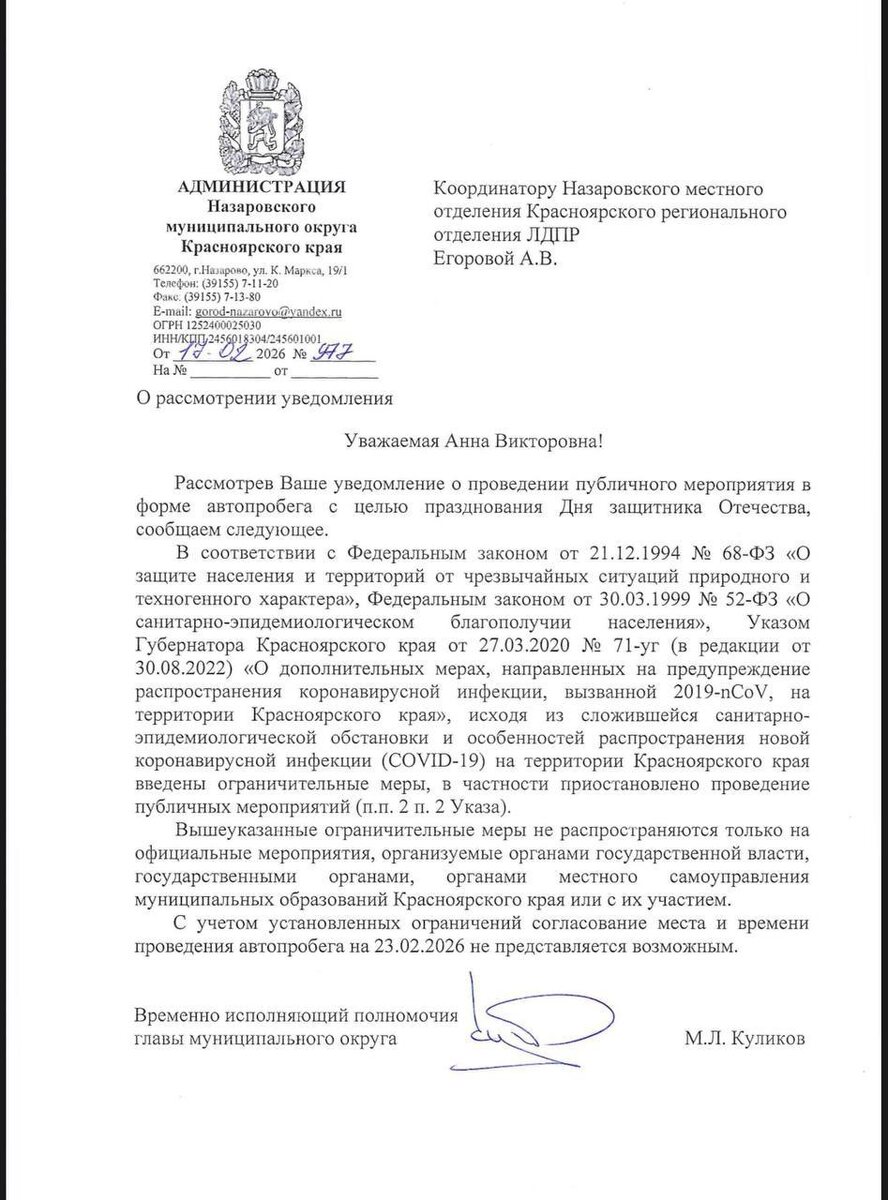 ЛДПР в Назарово отказали в проведении автопробега в честь Дня защитника Отечества, якобы из-за антиковидных ограничений. При этом повсеместно проходят концерты, спортивные турниры и другие мероприятия, и ни у кого нет вопросов ни к эпидемической обстановке, ни к мерам безопасности. На федеральном уровне все антиковидные меры давно отменили. Роспотребнадзор снял все ограничения, включая масочный режим и запреты на работу, на фоне устойчивого снижения заболеваемости еще в 2022 году. «Такое поведение подрывает доверие к власти. Врио главы Назарово Куликов придумывает ковидные угрозы там, где их уже давно нет. Это выглядит как злоупотребление властью и административный произвол», — подчеркнул Семён Сендерский. Руководитель фракции ЛДПР в Красноярском горсовете уже подготовил обращение губернатору. Он убежден, нужно либо отменять Указ, либо привести в чувство подчиненных, которые иногда теряют связь с реальностью.
