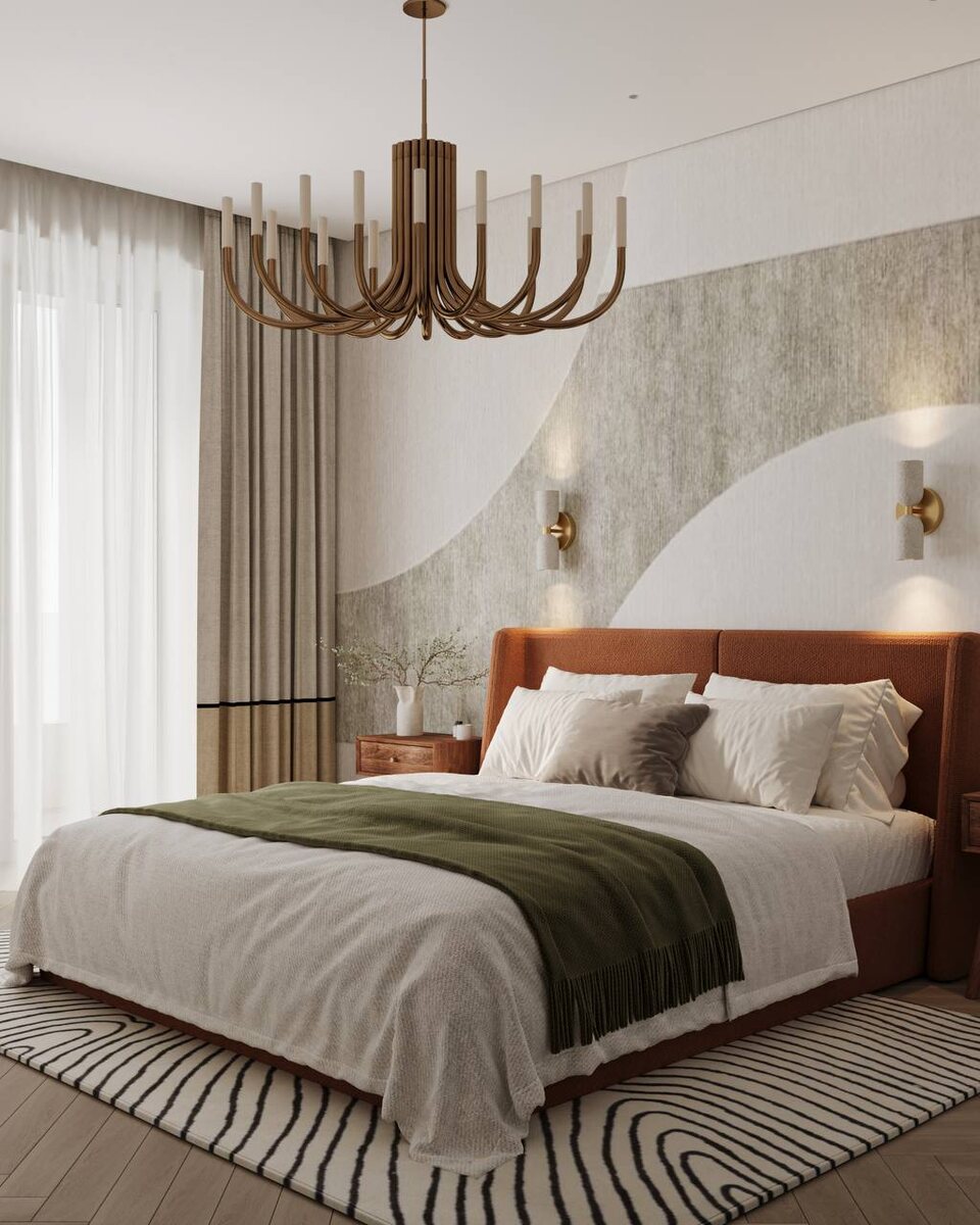 Это может быть: выразительная люстра, бра с характерной формой, фактурное изголовье, качественный плотный текстиль.