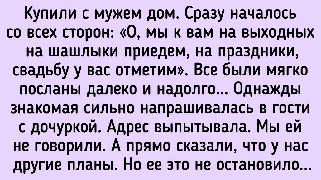 Продали квартиру и купили с мужем полгода назад дом. Сразу началось со всех сторон: «О, мы к вам на выходных на шашлыки приедем, на праздники, свадьбу у вас отметим». Все были посланы далеко и надолго... Однажды знакомая сильно напрашивалась в гости с дочуркой. Адрес выпытывала. Ни я, ни муж ей не говорили, а прямо сказали что на выходных другие планы и к гостям не готовы в ближайшие месяцы, еще ремонт в планах. Но ее это не остановило. Не знаю, как она отыскала адрес, но приперлась. Ну что ж, постояла за воротами и уехала. © svetik5407 / Pikabu