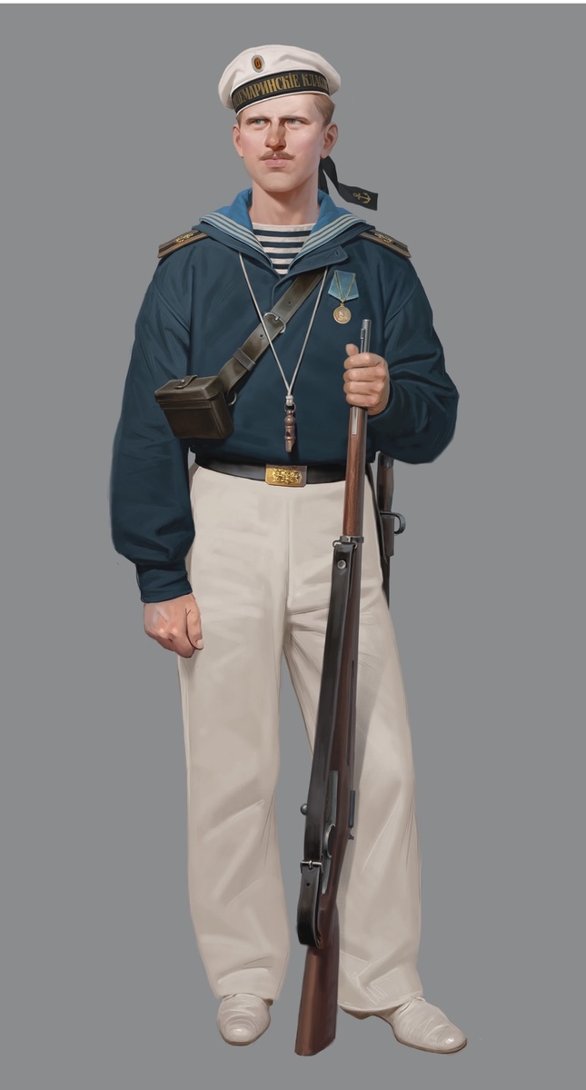 Гардемарин Отдельных Гардемаринских классов 1916 г. Винтовка - японская системы Арисака, снаряжение - патронная сума, поясной ремень со штыковыми ножнами и свисток на шнуре. Корабельный гардемарин - механик, 1910-1914 гг. Рисунок Н. Зубкова С 1910 г. все категории корабельных гардемаринов снабжались синими кителями офицерского образца. Околыш фуражки и погоны - черные с красными выпушками, металлический прибор обмундирования - серебряный. Такая же форма полагалась корабельным гардемаринам - судостроителям. В 1914 г. выдача корабельным гардемаринам офицерского холодного оружия была прекращена, однако неизвестно, означало ли это отказ от его ношения или же гардемарины просто стали приобретать сабли и кортики за собственный счет. На нагрудном кармане - знак Морского инженерного училища Императора Николая I. Матрос Гвардейского экипажа в береговой форме , 1913-1917 годы. Рис. Николая Зубкова. В дни Февральской революции командором Экипажа был великий князь Кирилл Владимирович. Как вспомина