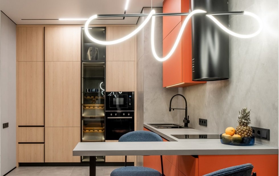 Нескучный интерьер для активной семейной пары Место: Москва Метраж: 63,7 кв. м Год реализации: 2025 Комнаты: 2 Cанузлы: 2 Высота потолков: 2,9 м Дизайн: Студия интерьерного дизайна Маргариты Макуриной Фото: Максим Канакин Интерьер этой двушки создавался для молодой пары, работающей в крупной российской IT-компании. Они любят принимать гостей, путешествовать, заниматься спортом и ведут насыщенный образ жизни. В ближайшие годы они планируют завести детей. Заказчики пожелали светлый интерьер с яркими акцентами и нестандартными решениями в отделке, поэтому обратились к дизайнеру Маргарите Макуриной, чтобы реализовать ее авторский стиль. Изначально в квартире была предусмотрена типовая планировка от застройщика. Ее немного скорректировали: второй санузел уменьшили для того, чтобы разместить более глубокий шкаф в прихожей. В квартире имеется просторная кухня-гостиная, спальня, кабинет, который в будущем может быть трансформирован в спальню, прихожая и два санузла. В кухне-гостиной ярким акц