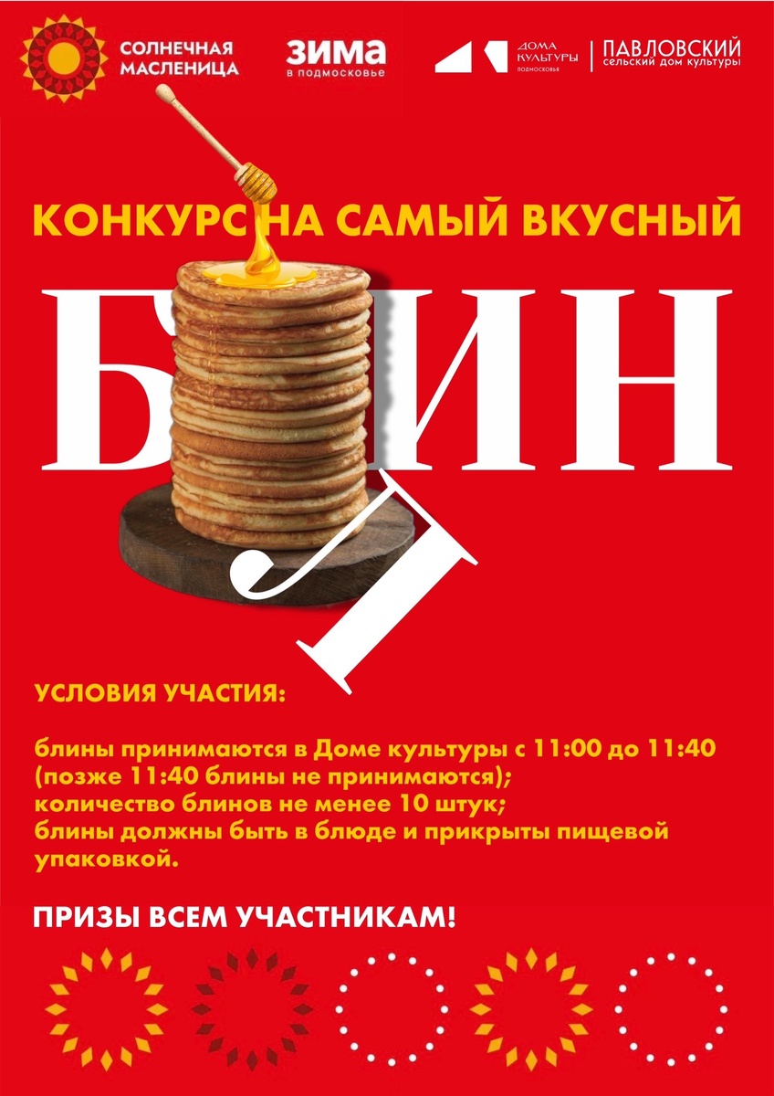 ✨ САМЫЙ ВКУСНЫЙ БЛИН 🥞 Любимый конкурс наших кулинарных мастериц и мастеров пройдёт прямо во время гуляния! Условия участия просты: ✔️Испечь не менее 10 блинов; ✔️С 11:00 до 11:40 передать блюдо в дом культуры; ✔️ждать результатов ☺️ Во время масленичного гуляния, мы подведем итоги 😉 ПРИЗЫ ВСЕМ! 🏆 📆 21.02.2026 🏢 Павловский сельский дом культуры (СДК) 📍 г.о.Домодедово, дер.Павловское, ул.Вокзальная, д.18 ✅ Мероприятия Домодедово https://dzen.ru/id/66f10385cc4c5a16f7b5fb02 http://vk.com/domodedovo_events http://dzen.ru/domodedovo_events