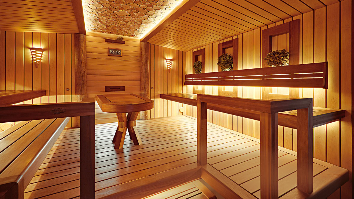 Эта парная находится в Брянске, в частном доме на берегу озера. На ее стенах панели из ольхи со вставками из термоосины, а в нишах панели из красного канадского кедра. Парная очень большая: 5 х 4,4 м и высотой 3,2 м, поэтому было принято решение сделать подиум, который дает целый ряд преимуществ. Во-первых, пар не уходит при открытии дверей, так как он собирается выше. Во-вторых, обеспечен более равномерный прогрев помещения: обычно у пола намного прохладнее, а здесь человек находится выше уровня печи. В-третьих, достигается более равномерное перемешивание воздуха, благодаря тому, что он опускается сквозь подиум в вытяжку. Прямо к столу для парения из стены подается подогретый свежий воздух с улицы. Полубревна из сосны Кело зонируют пространство. На потолке — спилы можжевельника с подсветкой. Подиум и полки изготовлены из термоосины. Стена и потолок около печи отделаны плиткой из талькомагнезита. В парной есть краны с горячей и холодной водой. Сердце парной — печь-каменка, облицованная