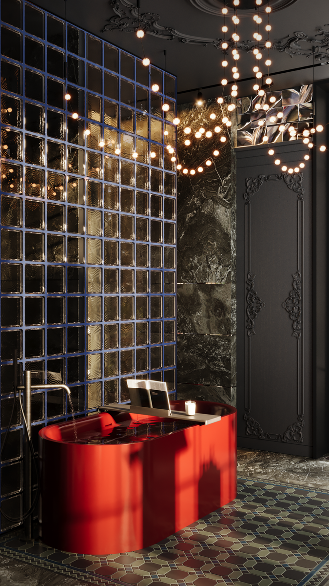 Эта комната не просто ванная — это будуар, достойный оперной дивы или героя нуарного романа. Представьте себе пространство, где торжественная мрачность встречается с чувственной страстью, а строгая геометрия — с прихотливой игрой линий. Основное настроение задают стены, окрашенные в глубокий, почти антрацитовый оттенок. Этот цвет — не фон, а скорее, драгоценная оправа. Он бархатистый и плотный, как ночное небо без единой звезды, и именно в этой темноте рождается магия контрастов. От пола к потолку поднимаются замысловатые узоры ажурной лепнины. Это не тяжеловесная лепнина дворцовых зал, а нечто более утонченное — растительные орнаменты, вьющиеся стебли, изящные завитки. Белоснежная, безупречная лепнина выступает на темных стенах, создавая эффект древнего, благородного кружева, наброшенного на камень. Она перекидывается на потолок, где вместо люстры скрывается мягкая подсветка, заставляющая тени от лепнины танцевать на поверхности мраморного пола. Центр композиции — отдельно стоящая ван