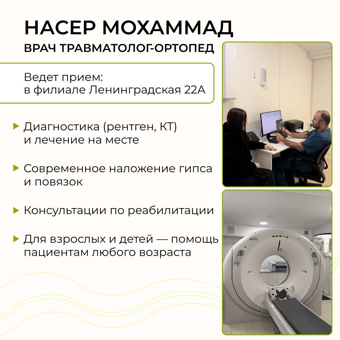 Травматолог-ортопед для детей и взрослых с полной диагностикой! 🩺 В нашем филиале: ул. Ленинградская д.22 теперь ведёт приём опытный травматолог-ортопед Насер Мохаммад для пациентов всех возрастов! ⚠️Диагностика на месте: После осмотра вы сразу сможете пройти необходимое обследование — рентген или КТ в том же здании. ⚠️Для взрослых и детей — помощь пациентам любого возраста. ⚠️Современное наложение гипса и повязок. ⚠️Консультации по реабилитации. Когда обратиться? · Боли в суставах, спине, стопах · Последствия травм и переломов · Плоскостопие и нарушения походки у детей · Деформации стоп (косточка на ноге) · Подозрение на артроз, артрит · Спортивные травмы _______ ☎️Записаться к специалистам: +7 499 400-35-33 🌐на сайте https://podolskclinic.ru #медицина #ортопедия #травма #больвспине #больвколене #КТ #врач #здоровье