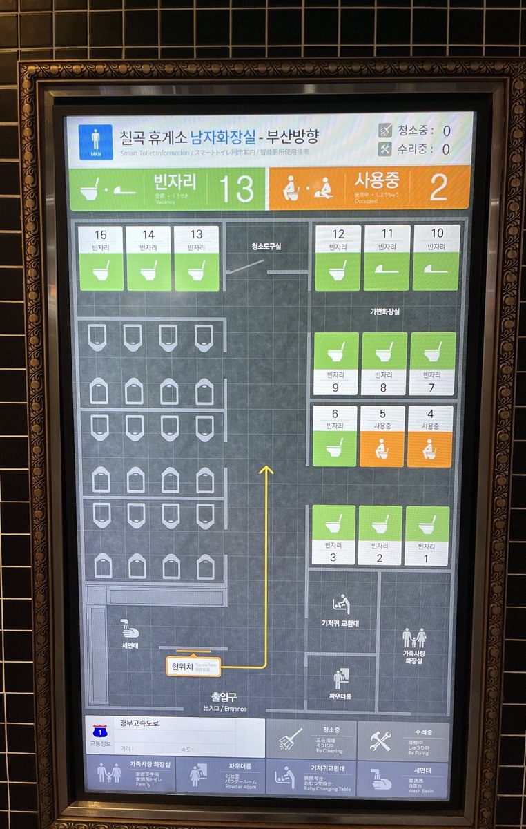 Janubiy Koreyadagi jamoat hojatxonalaridan birida innovatsion yechim. Kiraverishdagi elektron tablo orqali bo‘sh xonalar haqida ma’lumot olish mumkin.