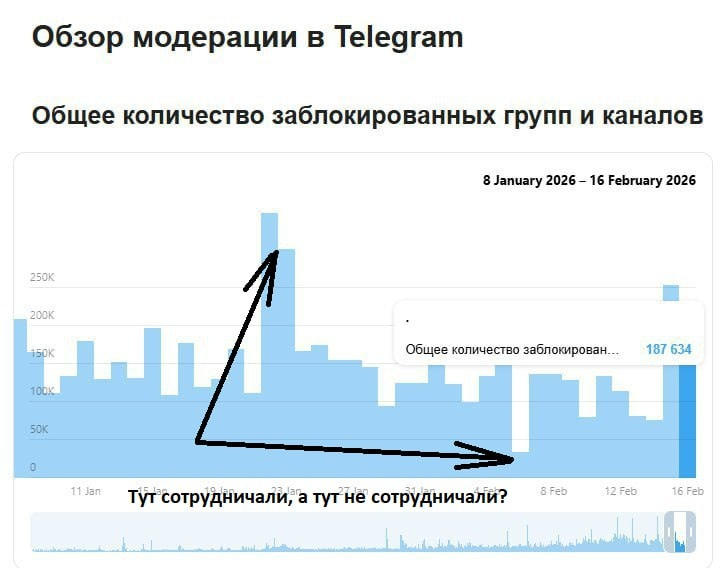 😛 По поводу вот этого графика, который подают как "телеграм идет навстречу" - это скорее попытка выдать желаемое за действительное. Телеграм каждый день удаляет каналы, и 15-16 февраля количество забаненных было всего лишь чуть выше среднего, например, в январе были дни, когда блокировалось больше каналов. Так что пока, к сожалению, не видно никакого взаимопонимания между РКН и администрацией телеги. По крайней мере, никаких объективных данных об этом говорящих нет. Надеюсь это взаимопонимание будет достигнуто. Но сомневаюсь. И Дуров упертый, и я не совсем уверен в адекватности требований. Самый выигрышный вариант, кстати, Президенту на какой-нибудь пресс-конференции сказать "ай-яй-яй", погрозить РКН пальцем и высочайшим повелением закончить этот цирк.