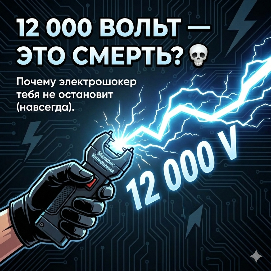 Многие приходят в ужас, видя на коробке электрошокера цифры: 10 000, 20 000 или даже 50 000 Вольт. Кажется, что это гарантированный билет на тот свет, ведь в обычной розетке всего 230 В, и она крайне опасна. Но вот парадокс: после удара шокером человек отделывается испугом и судорогами, а прикосновение к высоковольтной линии заканчивается трагически. В чем подвох? Давайте разбираться с точки зрения электротехники. Это старая поговорка, которая верна лишь наполовину. На самом деле убивает энергия и путь тока через тело. Напряжение (Вольты) — это лишь «давление», которое заставляет заряды двигаться. Но чтобы нанести реальный вред, источник должен иметь возможность поддерживать это давление при нагрузке. Электрошокер — это мастер иллюзий. И вот три причины, почему он физически не может быть летальным. Внутри любого шокера стоит повышающий трансформатор. Чтобы поднять напряжение с 3.7 В (от аккумулятора) до 12 кВ в таком маленьком корпусе, инженерам приходится идти на хитрость. Вторичная