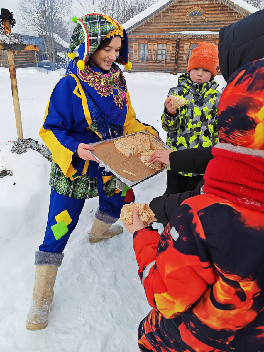 Рядом с гигантской Печью нас встретили две задорные ведущие, одетые в костюмы скоморохов. Разделив нашу группу на две «деревни» они предложили посоревноваться, ведь это было в традиции масленичной недели, а попутно вели свой рассказ о названиях дней этой недели, почему они так назывались, и какие обычаи сопровождали каждый из дней.
