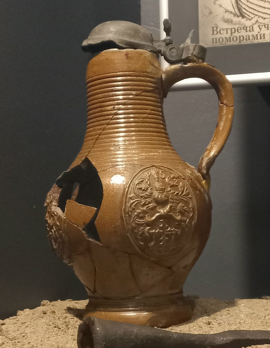 из Музея Арктики и Антарктики. Баренца -- потому что найден учеными на месте стоянки В. Баренца 1597 года. Виллемов кувшин из МАиА, на экспозиции. Для сравнения: фрагмент натюрморта Питера Класа из Эрмитажа, 1636. У кувшина с картины на боку герб Амстердама. А на горшке из музея - герб рода Шварценберг, одной из ветвей. По определению каталога каменной керамики Кельнского музея прикладного искусства 1972 года издания. Еще пара сосудов с той стоянки стоят в витрине Краеведческого музея в Архангельске. Их фото впереди)
