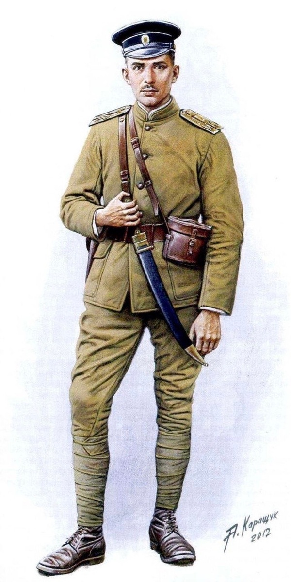 Морская пехота адмирала Колчака в Сибири. Офицер-артиллерист дивизии Морских стрелков. Начало осени 1919 г. Он одет во французское обмундирование колониального образца (цвета хаки), которое начало поставляться войскам Колчака в августе-сентябре 1919 г. О его бывшей принадлежности к Российскому императорскому флоту свидетельствует чёрная фуражка, которую он предпочитает носить вместо предписанной защитной. Погоны золотого галуна с чёрными просветами и кантами; на них золотая шифровка «М.С.» и скрещённые пушки. Не имея кортика или шашки, он в соответствии с приказом по дивизии от 27 сентября 1919 г. получил бебут. Рисунок Андрея Каращука. Морская пехота Колчака. Стрелок Морского учебного полка в начале Сибирского Ледяного похода. Ноябрь 1919 г.