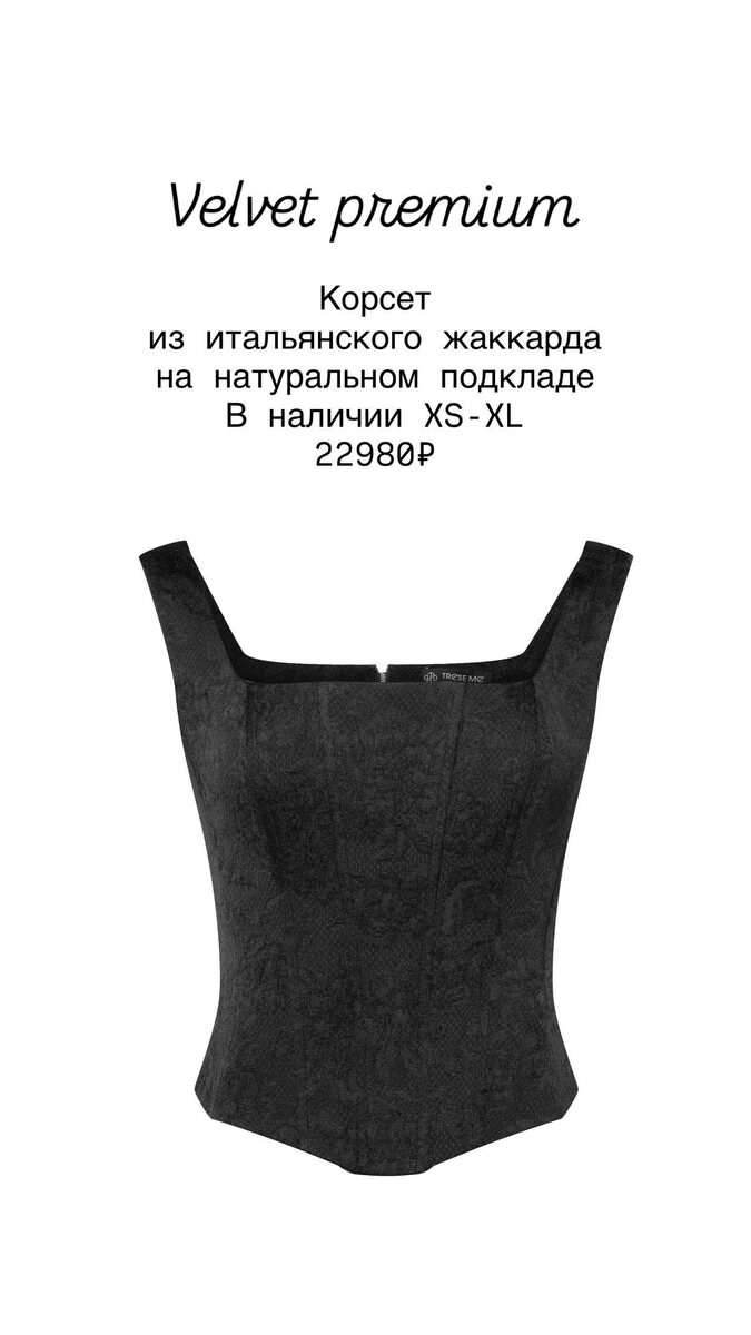 оформить заказ онлайн: ⚡️ Роскошный корсет Velvet из черного жаккарда с вышивкой за 14990₽ ⚡️ Брюки-палаццо, та самая модель из плотного крепа, высокая посадка по талии и струящийся крой, за 8490₽