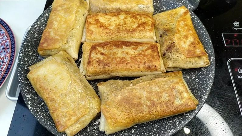 Сегодня я покажу, как готовлю тонкие блинчики с начинкой из куриной печени и грибов. Блюдо получается сытным, ароматным и вполне бюджетным. А ещё такие блинчики очень удобно заготавливать впрок: начинил, сложил в контейнер, убрал в морозилку — и в любой момент можно достать и разогреть. Ингредиенты Для теста: Молоко — 400 мл Вода — 400 мл Мука — 300 г Яйца — 2 шт. Соль — 1 ч. ложка Сахар — 2 ч. ложки Сода — 1/2 ч. ложки Масло растительное — 3 ст. ложки Для начинки: Куриная печень — 700 г Морковь — 250 г (1–2 шт.) Лук — 200 г (2–3 шт.) Шампиньоны — 300 г Готовлю тесто В глубокую миску разбиваю яйца, добавляю соль, сахар, молоко и муку. Перемешиваю венчиком до однородности. Комочков быть не должно. Затем вливаю растительное масло и воду. Ещё раз хорошо перемешиваю. Оставляю тесто на 10 минут постоять — так оно станет более эластичным, и блины будут лучше сниматься. Пеку блины Сковороду хорошо разогреваю. Ничем её не смазываю — в тесте уже есть масло, и блины не прилипают. Жарю на сильном