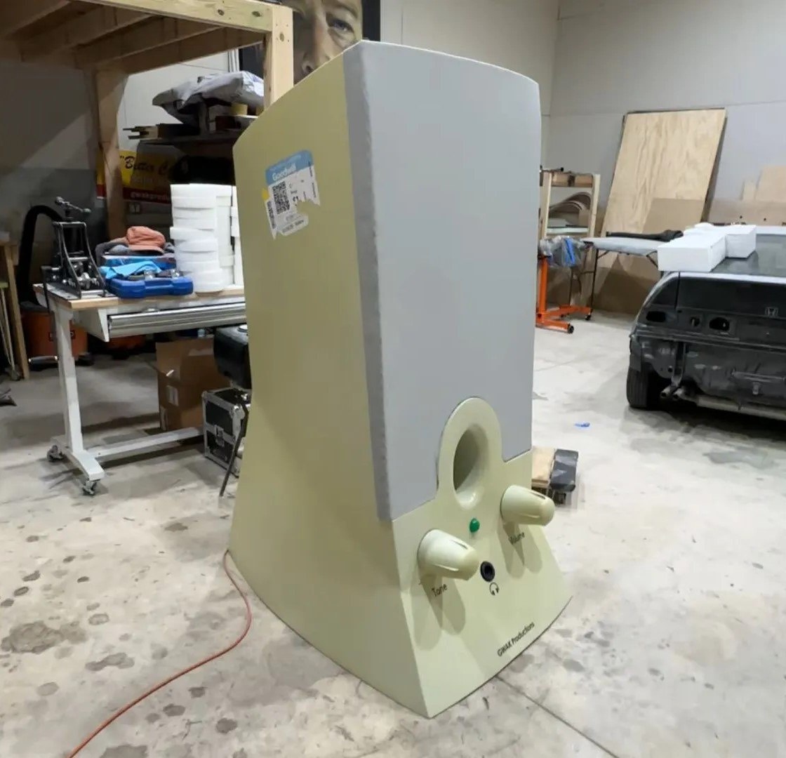 🔊 YouTube-энтузиаст Gwak собрал гигантскую версию культовой компьютерной акустики Harman Kardon HK 19.5 2.0, которая стояла у многих рядом c ПК в конце 90-х и начале нулевых. Оригинал был всего около 17 см в высоту. Новая версия – примерно 170–185 см, то есть в 10-11 раз больше. И это не просто макет: внутри находятся полноценные рабочие динамики. Корпус сделан из дерева, но покрашен так, что выглядит как пластик. Верх передней панели затянут тканью как у оригинала. Даже правая ручка громкости щёлкает при включении так же аутентично. Теперь осталось увеличить ЭЛТ-монитор до 170 дюймов и можно возвращаться в 2001-й 😉