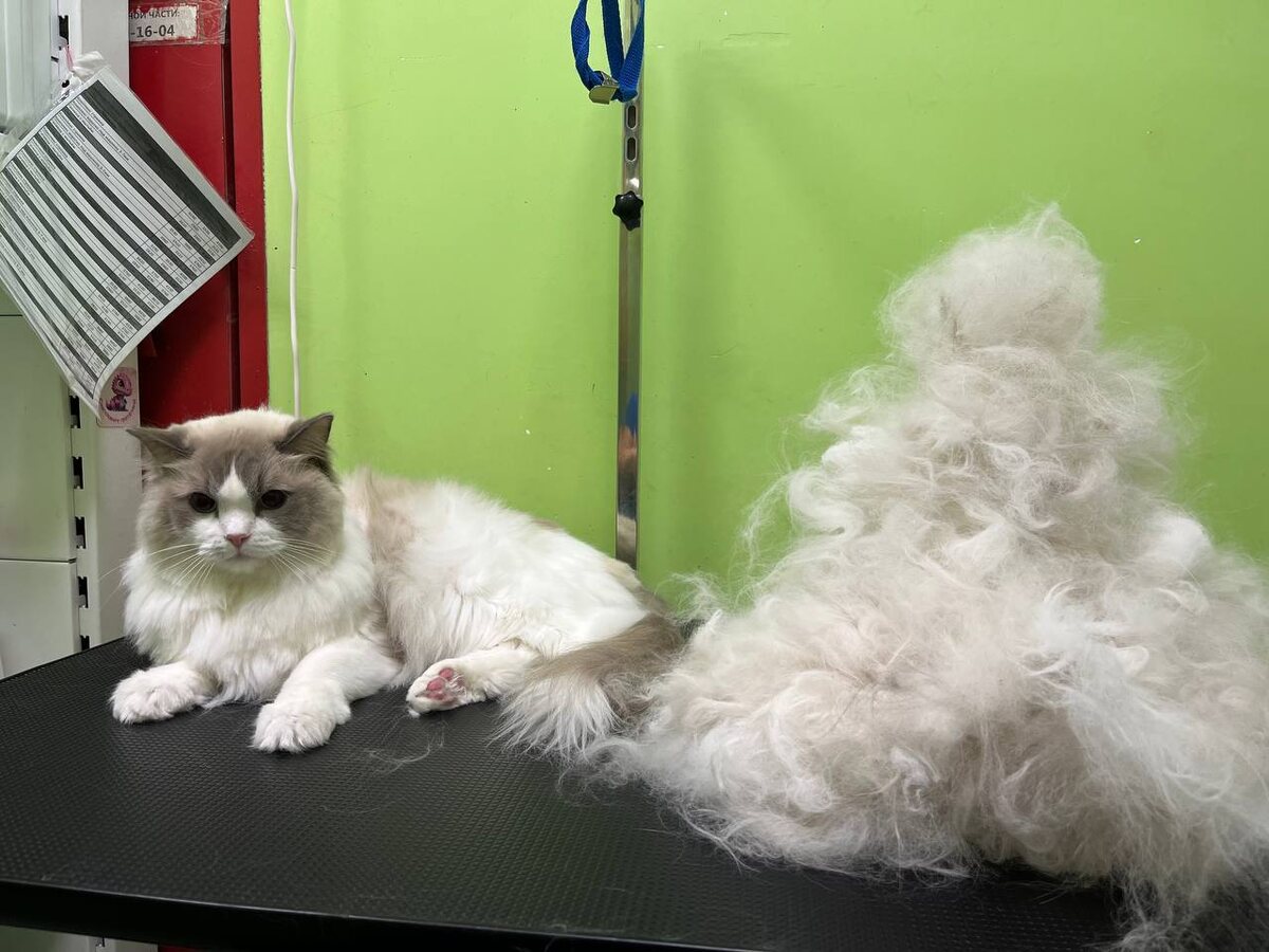Вот так выглядит экспресс- линька для рэгдолла)) Кот вполовину становится меньше,зато ни колтунов, ни срыгиваний от забившей желудок шерсти