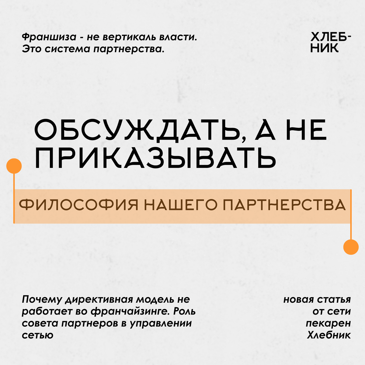 В Хлебнике мы отказались от директивной модели как основы управления. Наша задача – выстраивать диалог с франчайзи, которых мы с гордостью называем партнерами, и принимать совместные решения. Это требует больше вовлеченности, но работает устойчивее в долгую.
