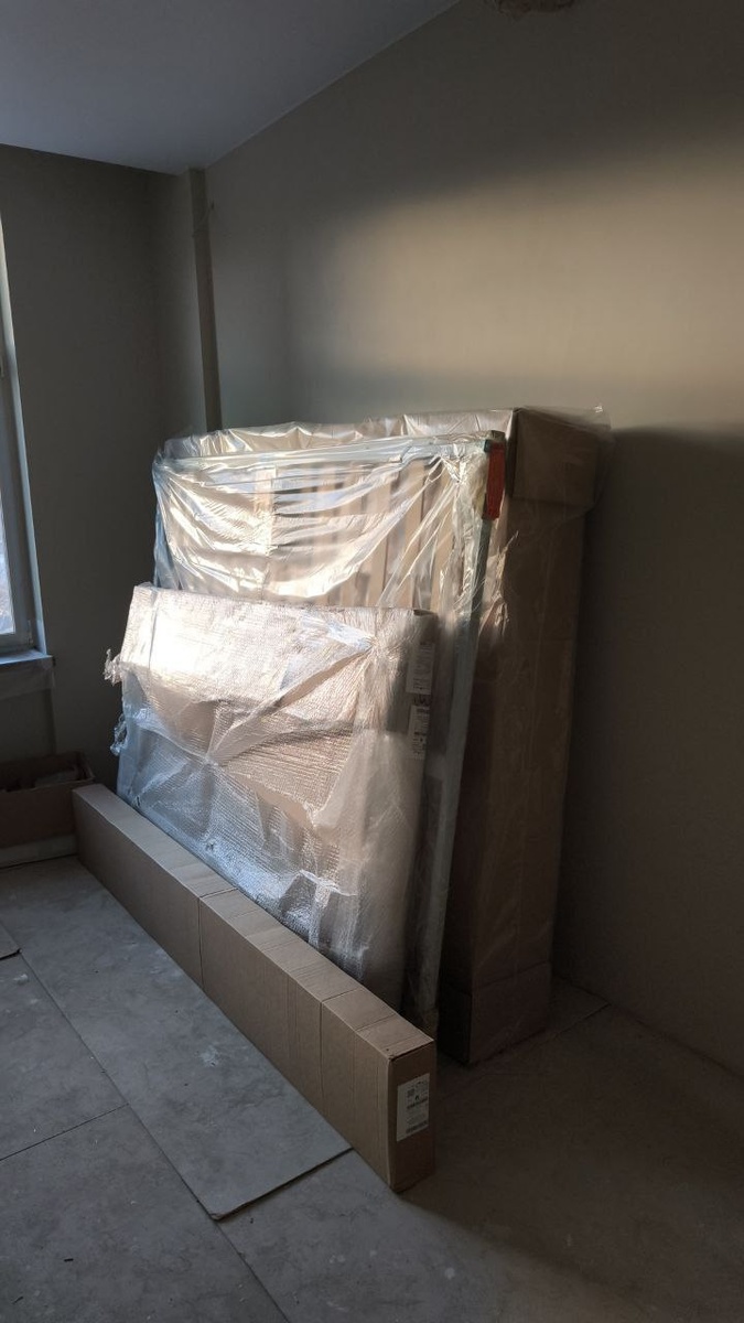 На объект продолжают привозить мебель: уже на месте столы, стулья, диван и кровать — квартира буквально обрастает жизнью.🪑 Диван и стулья заказывали в разных магазинах, поэтому важно было попасть в один оттенок обивки. Мы ездили лично подбирать ткань, и, как видите, цвет совпал — гарнитур выглядит как единый комплект, а не набор случайных предметов.😎 #КатяРаботает