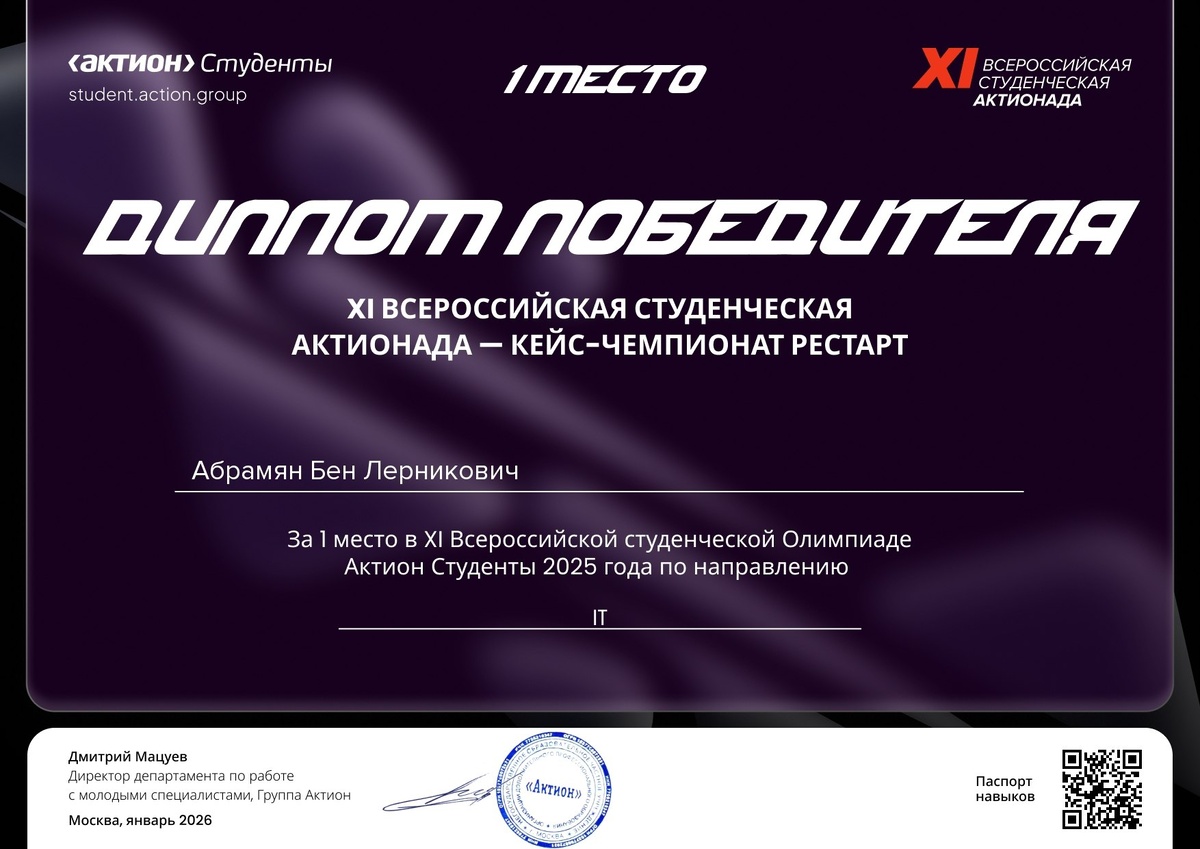 ! Студент #КолледжКоломна, обучающийся по специальности «Информационные системы и программирование» в рамках кластера #СМИиКТ Федерального проекта «Профессионалитет» национального проекта «Молодежь и дети», доказал свой высокий уровень на всероссийской арене. 🎓 Абрамян Бен стал абсолютным победителем, заняв 1 место 🥇 в направлении IT на XI Всероссийской студенческой Актионаде — Кейс-чемпионате «РЕСТАРТ». 👨💻✨ Напомним, что «Актионада» — это самое масштабное всероссийское событие для студентов высшего и среднего профессионального образования. 📚 Кейс-чемпионат «РЕСТАРТ» — это площадка, где будущие специалисты решают реальные производственные задачи, демонстрируя не только теоретические знания, но и практическую смекалку. 💡 Поздравляем Бена и его наставников с блестящим результатом! 🎊👏 Желаем дальнейших успехов в учебе и профессиональном развитии! 🚀🌟 #СПОмедиа #Профессионалитет