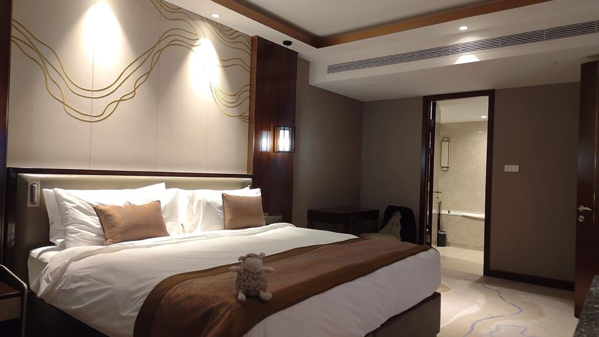 Большая кровать с разнообразной подсветкой, рабочий стол, лаунж-кушетка у окна. Вид вечером городской, но за счёт плотных штор (закрываются легким прикосновением к кнопке у кровати) можно полностью изолироваться — проверено на следующий день Овцой Борисом в режиме «послеобеденный сон». Есть отдельная рабочая зона у окна и лежанка, которую Овца Борис моментально оккупировал как наблюдательный пункт. Вечером за счёт тёплого света и текстиля пространство собирается — не холодный шоурум, а жилая история, где можно зависнуть с чаем или виски из того самого мини-бара. Ванная комната — отдельная тема. Просторная, с ванной и душем, плюс полноценная линия косметики Lalique — для городского люкса это уже уровень выше среднего. Мрамор, длинная столешница, нормальный свет у зеркала. Вердикт Овцы Бориса: Лотос в Soluxe Hotel Moscow — это про комфорт без показной театральности. Много воздуха, грамотная планировка, тёплый интерьер и нормальная операционка по оснащению. Номер, где одинаково удобно