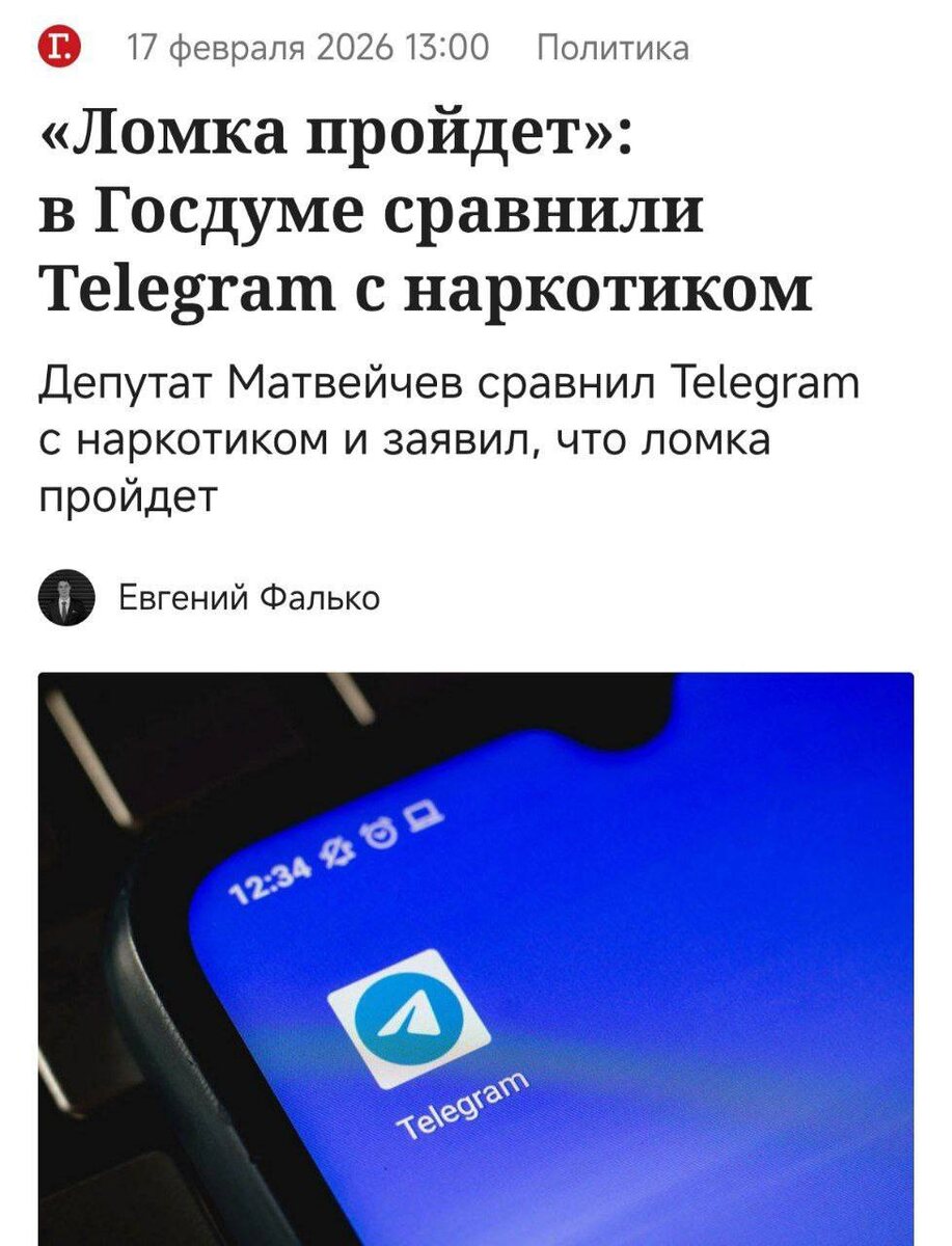 Это как наркотик, к которому привыкают, и если отмена происходит наркотика или запрет, то возникает ломка <...> Ломка пройдет точно так же, как была ломка с Instagram* и Facebook*, — заявил депутат Олег Матвейчев. Телеграмозависимые на месте? *принадлежат Meta, признанной экстремистской и запрещённой в РФ. Мы в Мах: max.ru/irbitincident