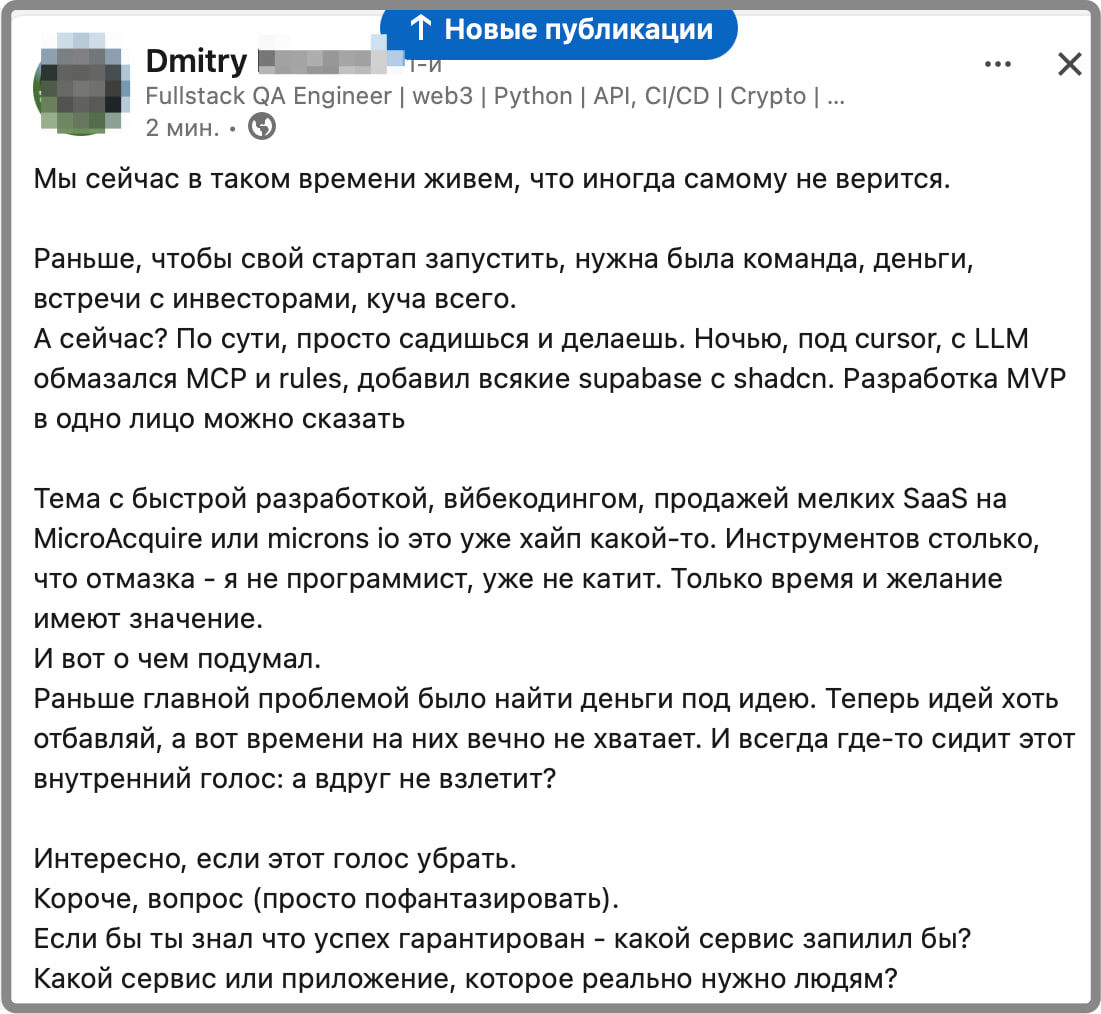 Нейронка поможет с идеей вашего нового стартапа в ИТ, нейронка поможет вам сделать его с помощью вайб- кодинга, нейронка напишет маркетинговый план... Вот только нейронка не найдет вам бабульки на рекламу, а еще она не найдет вам клиентов, если бабулек нет у вас. Вывод? Экономика внимания - это то, что будет самым важным в ИТ в будущем. Не благодарите :) Развивайте свои каналы коммуникаций... Русский ИТ бизнес