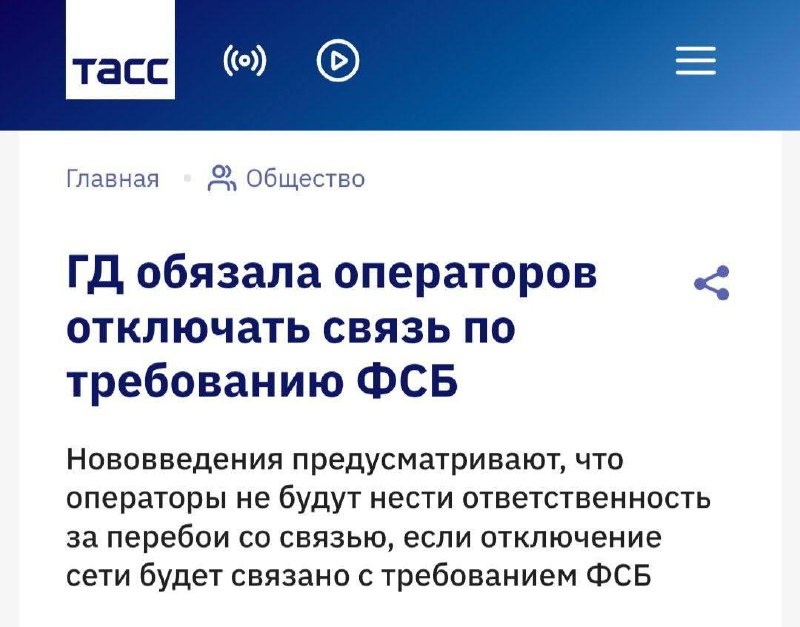 ⚡️ФСБ сможет отключать связь россиянам в любой момент — операторы обязаны будут подчиниться.