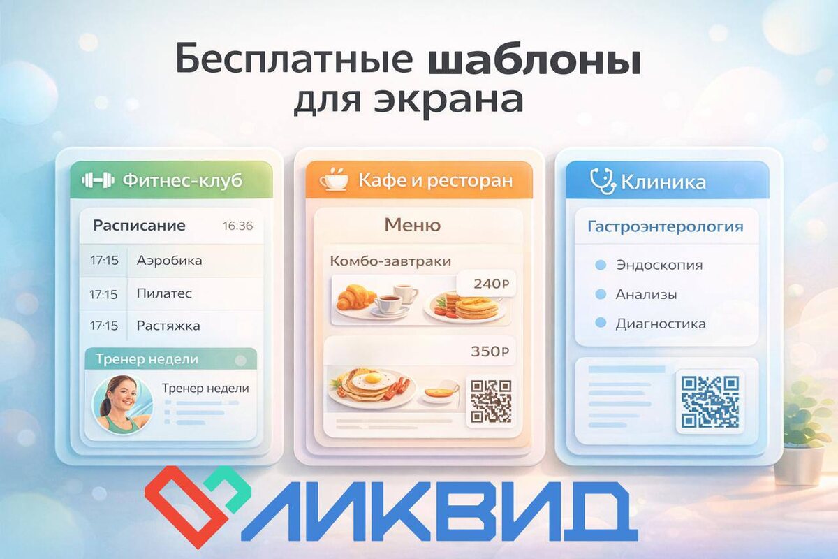 : И большинство ответили честно 👇 У нас нет контента и мы не знаем, что показывать на экранах Действительно, пустой экран пугает больше, чем подключение ТВ 😅 Поэтому, чтобы Вы не начинали с “черного экрана”, мы сделали бесплатные шаблоны под три бизнес сферы: ✅ Фитнес-клуб Расписание, анонсы тренировок, тренировка недели, промо. ✅ Кафе / ресторан Меню на несколько разделов, промо блюда с описанием, акция на конкретную позицию, реклама лучших блюд. ✅ Клиника / медцентр Визитка специалиста и врача, акции на процедуры, знакомство с врачом с детальным описанием. Как это работает: Выбираете нужный шаблон от Ликвид ❤️ → меняете тексты, цвета и фото под себя → публикуете на экран по ссылке. Всё уже собрано по логике: структура, блоки, заголовки. Не нужно придумывать «что бы поставить на ТВ». Вы просто адаптируете готовые решения под свой стиль 🎨 ✍️ Напишите в комментариях, как Вам наши шаблоны и для какой сферы бизнеса стоит сделать еще? #Ликвид #Шаблоны #Контент #DigitalSignage