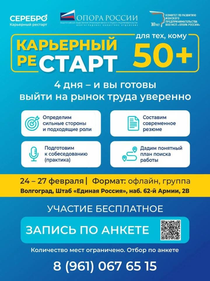 Благотворительный проект «СЕРЕБРО КАРЬЕРНЫЙ РЕСТАРТ 50-65» пройдет в Волгограде 24-27 февраля. Лучшие тренеры и предприниматели города помогут женщинам: - развеять сомнения в карьере, - иначе взглянуть на жизнь, - определить сильные стороны вашей личности и профессии, - составить правильное резюме, помогающее в трудоустройстве, - получить понятный план поиска работы, - подготовиться к собеседованию, - найти себя и свой путь! Мероприятие подойдет всем дамам, кто уже отчаялся, хочет изменить жизнь, но боится, что для этого слишком поздно; кто выгорел на старой работе; кто еще полон сил; кто думает, что люди в возрасте не нужны работодателям. Вместе все эти стереотипы можно изменить. Участие в акции бесплатное. Мероприятие пройдет в офлайн- формате. Для участия необходимы простая регистрация и заполнение анкеты по ссылке: https://forms.yandex.ru/u/696917e86d2d7311360b6217 Проводится при поддержке Комитета по развитию женского предпринимательства ВОО МСП «ОПОРА РОССИИ» Внимание! Количество