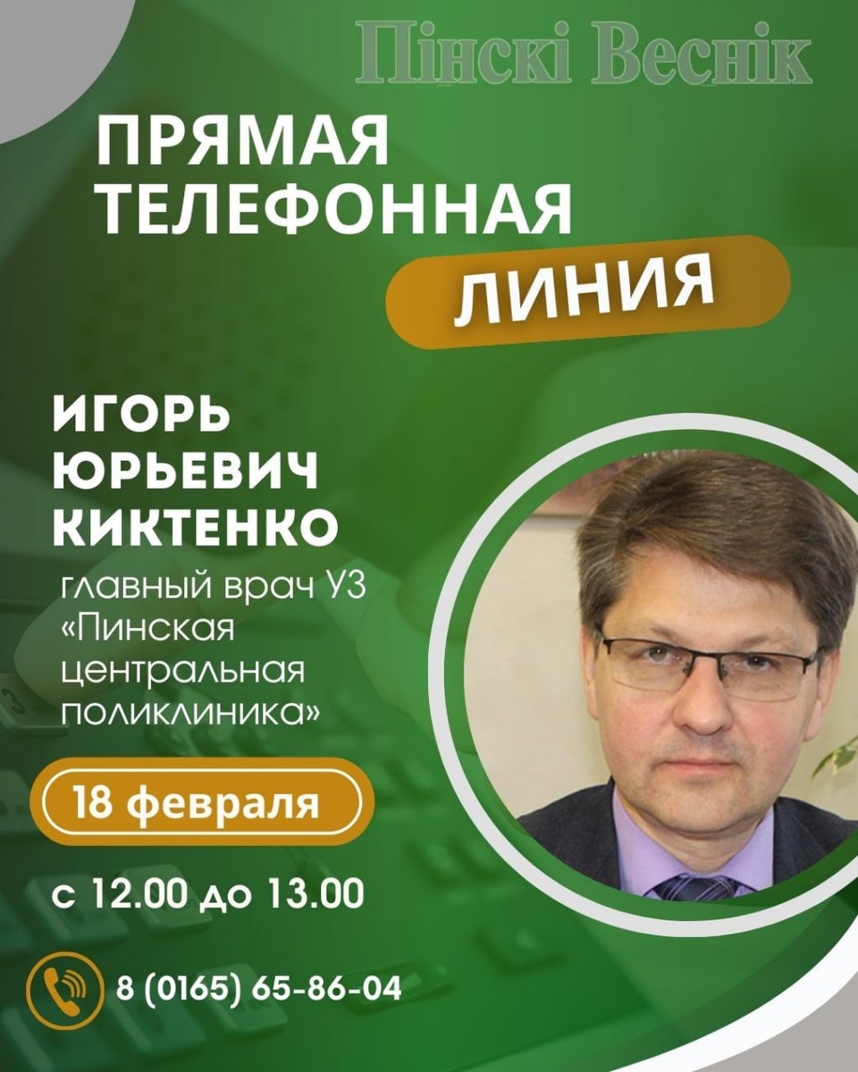 📍18 февраля с 12.00 до 13.00 прямую телефонную линию проведет главный врач УЗ «Пинская центральная поликлиника» Игорь Юрьевич Киктенко по тел.: 8 (0165) 65-86-04.
