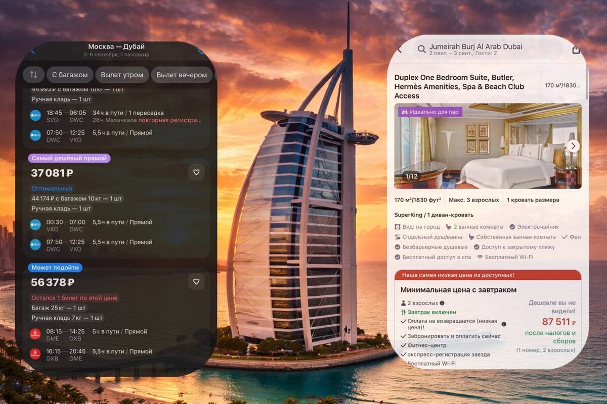 Все вы наверняка видели на картинках этот отель-символ Дубая. Но уверена — сколько стоит туда поехать, вы даже не пытались узнать. Давайте посмотрим вместе?😉 Куда? Дубай 🇦🇪 Burj Al Arab Jumeirah Тот самый отель-парус, который давно стал визитной карточкой эмирата. Его называют «7-звёздочным» (официально 5*, но мы понимаем 😉) Чем он особенный? Здесь нет обычных номеров — только двухуровневые люксы. Персональный батлер - если знаете кто такой, напишите в комментариях 😉 Rolls-Royce в трансфере. Частный пляж. Вертолётная площадка на крыше. Отель полностью про статус, ощущение масштаба и тот самый уровень, к которому кто-то просто относится спокойно, а кто-то ставит как цель. Сколько это может стоить? 💲 ≈ 124 592 руб. Проезд: Москва — Дубай — Москва 37 081 ₽ (без багажа, прямой рейс, я брала даты 02.09.2026 - 06.09.2026) Проживание: Burj Al Arab Jumeirah ≈ 87 511 ₽ (за одну ночь) в Burj Al Arab Jumeirah можно остаться на одну ночь в обычном люксе (не только в самых дорогих сьютах), но