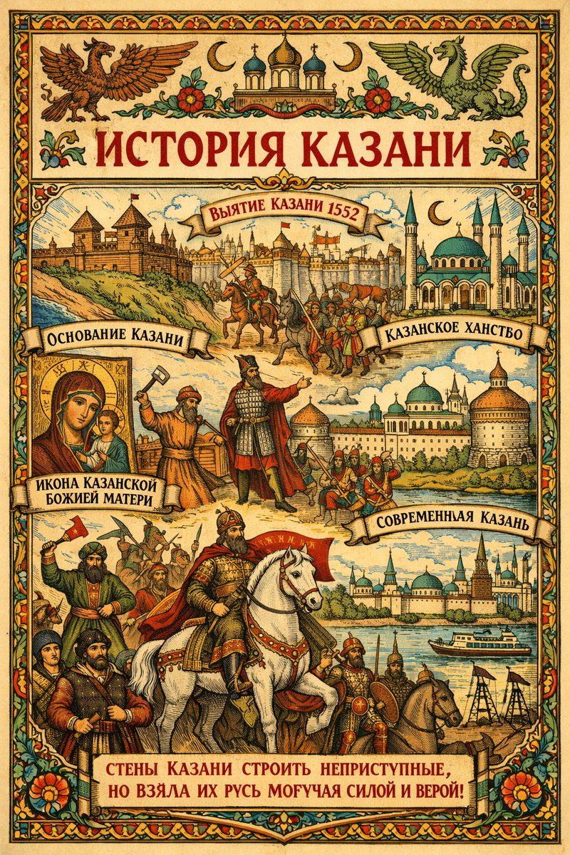В лето давнее, егда Волга-река широка и Кама быстра, стояше на высоком бреге град Казань, яко страж на путех водных. Сказывают старцы, яко от булгар волжских начаток прия, и торгом укрепися: меха и воск, мед и хлеб, железо и соль шли чрез пристани, и шум стоял на торжищах, и язык многий слышашеся. И бысть по временам тягота велика: ордынская держава на земли сии простре руку, и князи местнии дань воздаваху, дабы мир соблюсти. Но не токмо данью живаше град: ремеслами красен бе — кожами выделанными, чеканом серебряным, узорами на кости и дереве; и мечети, и церкви, и дворы купеческие рядом стояху, и люди различныя под единым небом жительствоваху. В лето же 6960-е и далее, по разорении Орды, воздвижеся Казанское ханство, и царствоваша ханы, крепость множаху, и воинством хваляхуся, и на рубежах с Русью то мир творяху, то рать замышляху. И мнози пленники и послы ходиша меж градом и Москвою. В лето 7060 (1552) прииде царь Иван Васильевич со множеством ратников, и приступи к стенам Казани. И