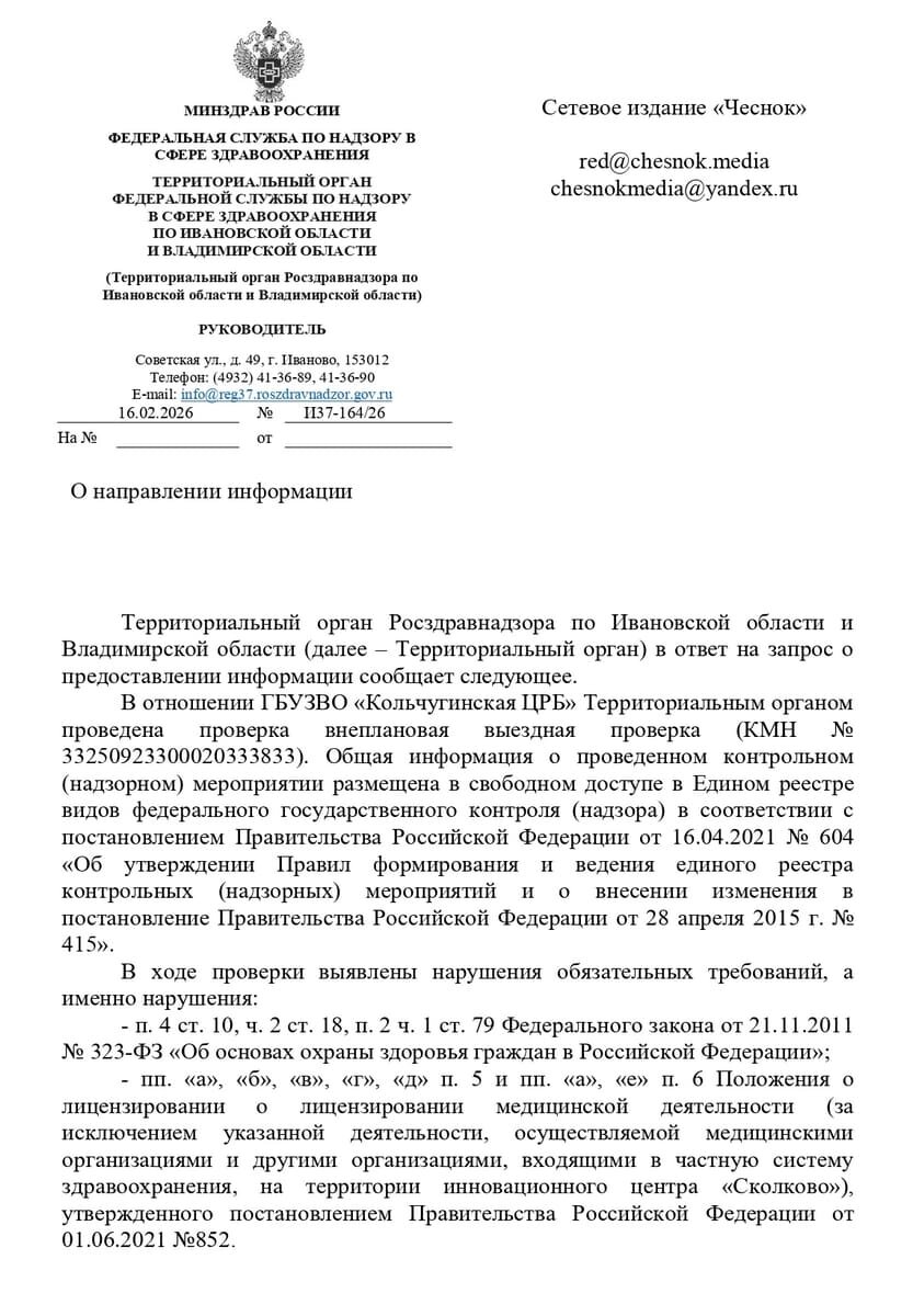 Родильное отделение в Кольчугино столкнулось с новой проблемой. Росздравнадзор провел внеплановую проверку больницы и нашел нарушения. Согласно ответу Росздравнадзора на запрос «Чеснока», в ходе проверки выявлены нарушения закона «Об основах охраны здоровья граждан в РФ» и требований о лицензировании медицинской деятельности. Судя по обозначенным статьям, в больнице не соблюдались правила оснащения кабинетов и обслуживания техники, а у части персонала возникли вопросы к документам о квалификации. Кроме того, в медучреждении не был налажен должный контроль за качеством услуг и порядком их оказания. Росздравнадзор сделал выводы о нарушении ЦРБ стандартов оказания медицинской помощи и решает вопрос о возбуждении административных дел. Также больнице внесли предписание об устранении нарушений до 15 мая – этот срок кажется неслучайным, ведь именно до 15 мая минздрав продлил работу родильного отделения. Подписаться | Предложить новость