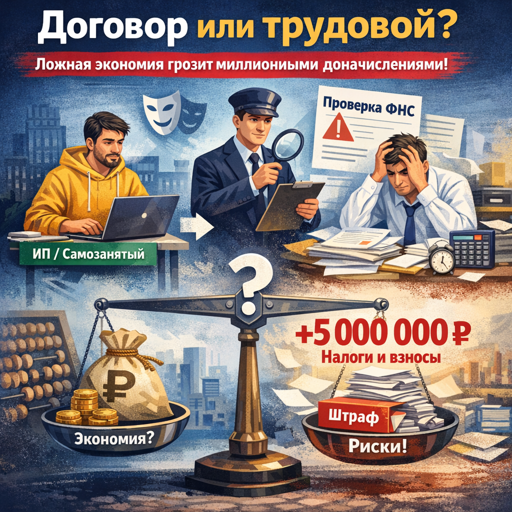Иногда собственники честно говорят: «Мы никого не обманываем, просто работаем с ИП и самозанятыми. Так удобнее и дешевле». И на первый взгляд это действительно выглядит как разумная оптимизация. Не нужно платить страховые взносы как за сотрудников, меньше кадровой нагрузки, меньше формальностей. Всё гибко, современно, по-деловому. Проблема начинается там, где форма не совпадает с содержанием. Если человек каждый день сидит в вашем офисе или подключается к корпоративной системе, работает по графику, подчиняется руководителю, получает фиксированную выплату два раза в месяц и выполняет не разовую задачу, а постоянную функцию — для налоговой это уже не подрядчик. Это сотрудник. И то, что в договоре написано «ИП» или «самозанятый», роли почти не играет. Сейчас налоговая активно проверяет такие схемы и переквалифицирует гражданско-правовые договоры в трудовые. А дальше начинается самое неприятное: доначисление НДФЛ и страховых взносов задним числом, за несколько лет, плюс пени и штрафы. Есть