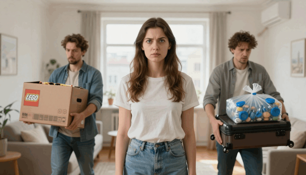 Он стоял на лестничной клетке, держа в одной руке огромную коробку с конструктором. В другой тащил чемодан на колёсиках. К ручке был привязан целлофановый пакет, и из пакета торчали знакомые белые крышечки. От сметаны.
