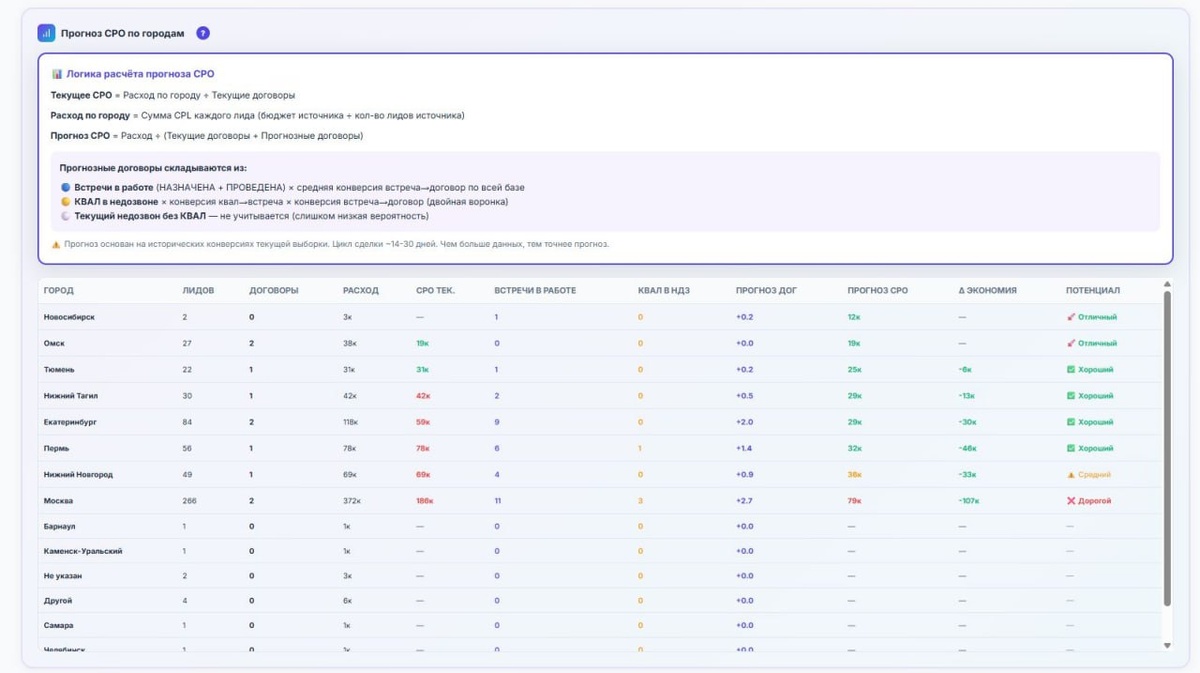 Меня честно бесит одна вещь в БФЛ. Очень долгий цикл сделки. Месяц. Иногда 3. Иногда 5. Лиды идут. Деньги тратятся. А решения о продлении принимаются «когда договора дойдут». И вот это ожидание — самая дорогая ошибка. Мы пошли по другому пути. ИИ анализирует поток лидов в моменте: – конверсии по менеджерам – процент недозвона – встречи (назначены / не назначены) – квал – динамику по источникам – исторические данные И на основе этого прогнозирует: – будущий CPO – вероятность выхода в договор – узкие места воронки То есть мы не ждём 2–3 месяца, чтобы понять, «зашёл» трафик или нет. Мы видим это через 7–14 дней. Например: если высокий недозвон — проблема не в лидах если встречи не назначаются — проблема в скрипте если квал разный по менеджерам — проблема в входе в диалог если CPO начинает расти — система это показывает заранее В итоге собственник и маркетолог принимают решение быстро. Не на эмоциях. Не на ощущениях. Не «подождём ещё месяц». А на данных. И самое важное. Таки