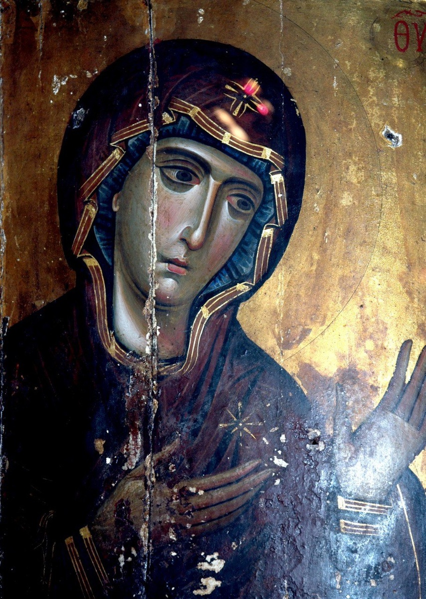 Здесь мы будем постигать язык иконы: от архитектурных основ храма до тончайших секретов иконописного мастерства. Каждый день будем разбирать один термин, раскрывая его смысл и историю, чтобы каждый из нас мог глубже понимать и чувствовать икону, следуя многовековой традиции, которую сегодня продолжают лучшие мастера. Начнем с буквы А. Словарь иконописца: АГИОСОРИТИССА Агиосоритисса — это особый иконографический тип Богородицы, где Она представлена без Божественного Младенца, обращённой в молитвенном порыве ко Христу. В деталях: Название образа происходит от греческого Agia Soros — «Святая Рака». Иконография восходит к византийскому храму во Влахернах, где хранился Пояс и Мафорий Пресвятой Богородицы. В отличие от «Одигитрии» (Путеводительницы), Агиосоритисса — это образ заступничества. Она стоит вполоборота, Её руки воздеты к деснице или полуфигуре Спасителя, словно передавая Ему прошения всего человечества. В русской традиции этот тип часто называют «Деисусной» иконой, так к