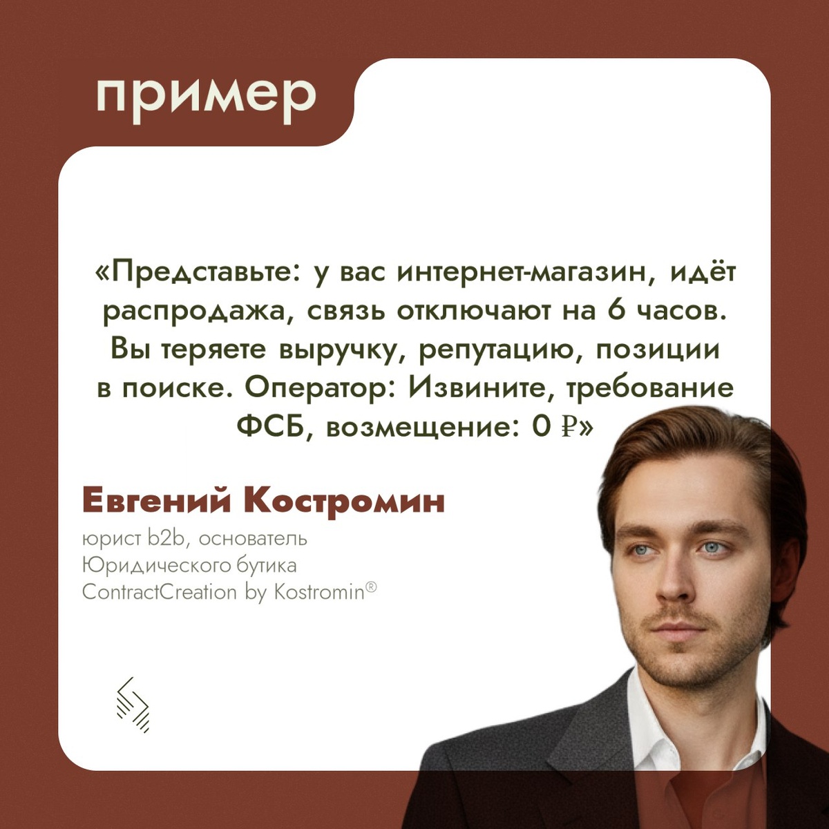 Что это значит для бизнеса - разбираю. В 3 чтении принят законопроект, на который я обращал ваше внимание ещё в ноябре, когда о нём почти никто не говорил. Документ прошел все чтения - и у вас есть повод пересмотреть риски. Что изменилось Операторы связи обязаны прекращать оказание услуг по требованию ФСБ, который действует по президентским актам. И они полностью освобождаются от ответственности перед клиентами за сбои, недоступность связи и любые убытки, связанные с таким отключением. Почему это важно для бизнеса 1️⃣ Нет компенсаций Если связь отключат - ни штрафа оператору, ни возмещения ваших убытков. Договорные обязательства оператора приостанавливаются автоматически. 2️⃣ Масштаб расплывчат Закон касается всех видов связи: мобильная связь, интернет и т.д. Озвучена мотивация - необходимость ограничивать связь при атаках БПЛА, но формулировки широкие. 3️⃣ Прозрачности нет Вы не узнаете заранее, когда и на какой срок отключат связь. Для бизнеса с процессами, которые зависят