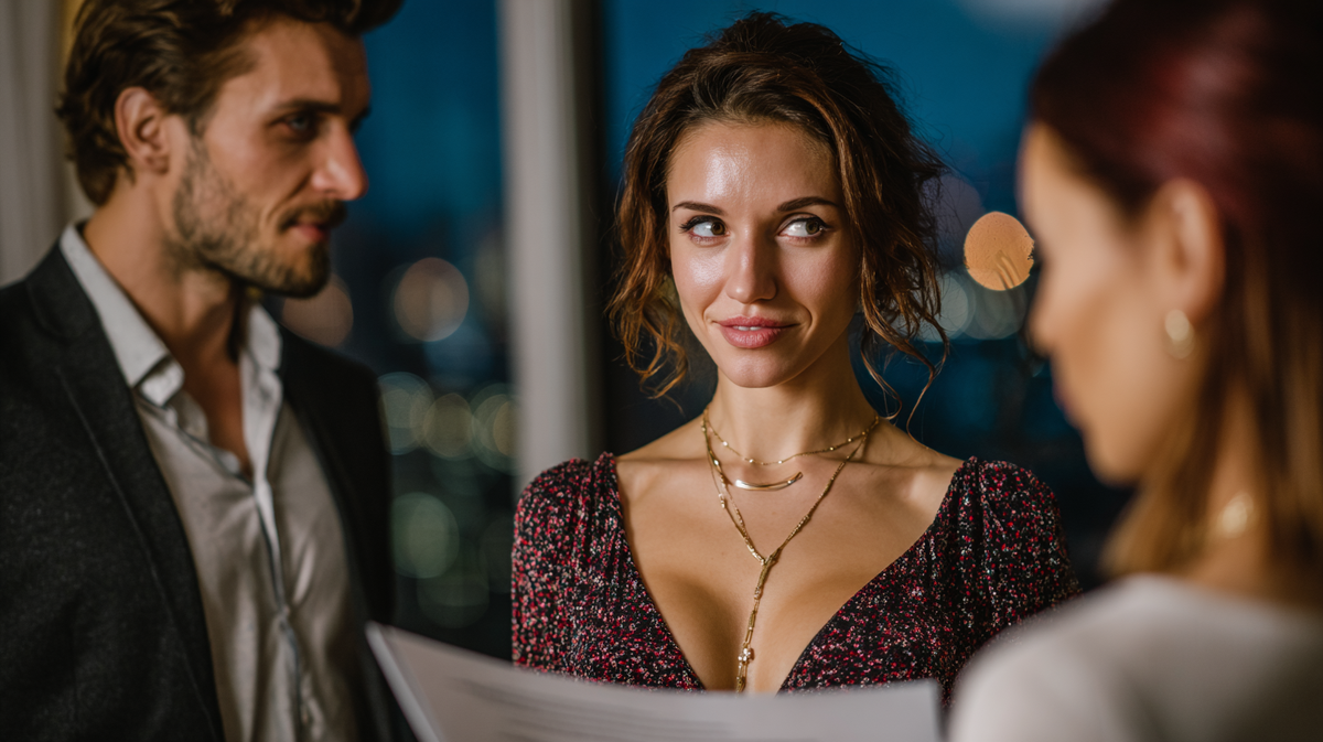 Секунды три в кабинете было тихо. Ни он, ни женщина в платье не двигались. Потом та тоже обернулась. Взгляд у неё был спокойный, почти любопытный — так смотрят на случайно вошедшего человека, которому сейчас вежливо укажут на выход. Никакого испуга. Никакой растерянности. Только лёгкое недоумение — кто пустил?