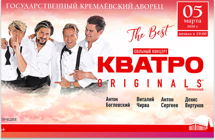 5 марта сцена Государственного Кремлевского Дворца перестанет быть просто сценой. Она превратится в пространство красоты и вдохновения, где четверо невероятных артистов, четыре изумительных голоса подарят зрителям главное — музыку, которая трогает до глубины души. ❤️ Группа КВАТРО ORIGINALS выступит с программой The Best. Это не просто сборник хитов. Это исповедь, признание и диалог со зрителем, который длится уже два десятилетия. Сегодня коллектив снова звучит в своем легендарном «золотом» составе. Антон Сергеев, Антон Боглевский, Денис Вертунов и Виталий Чирва — именно эти четверо двадцать лет назад задали высочайшую планку жанра классического кроссовера в России. И они по-прежнему остаются эталоном: интеллигентные, харизматичные, безупречно владеющие голосом и чувством стиля. В программе The Best — любимые классические произведения, зажигательные каверы и авторские хиты. Те самые песни, которые уже стали народными, и те, что только обретают этот статус. Каждое произведение в этот ве