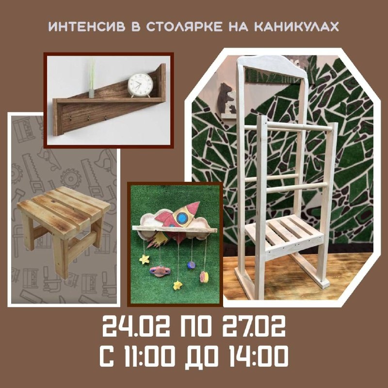 Впереди школьные каникулы — и мы предлагаем провести их с пользой с нашими друзьями и конечно же нами в столярной мастерской 🪵✨ Приглашаем ребят на интенсив: 📅 24–27 февраля 🕚 с 11:00 до 14:00 💰 Стоимость интенсива (4 дня) — 9400 ₽ За эти дни участники смогут смастерить что-то полезное и практичное для дома на выбор: 🔸 табуретку 🔸 вешалку 🔸 полку 🔸 или что-то уютное по собственным чертежам А между делом — будет не только работа, но и настоящее каникульное настроение: ☕️ чай и отдых 🎲 настольные игры 📚мастер-класс по шахматам от детского шахматного клуба «Совёнок» ⚔️ и даже азы фехтования вместе со школой «Эрудиум» — устроим небольшой поединок (безопасно, но очень эффектно!) Каникулы, после которых ребёнок принесёт домой не только впечатления, но и сделанную своими руками вещь — звучит отлично, правда? 📩 Запись в личные сообщения 📲 или по телефону: +7-916-777-68-34 Успевайте записаться — места ограничены!