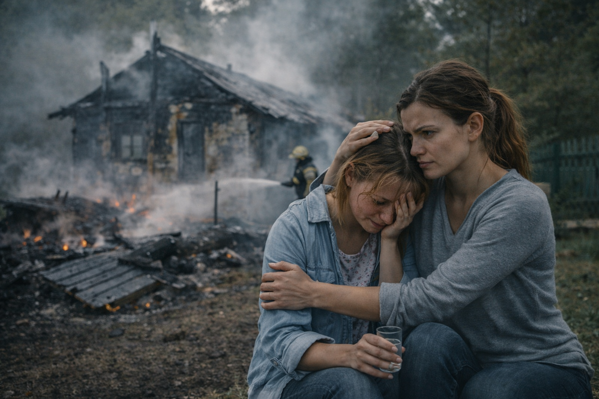 На месте дачного домика моей сестры – дымящиеся развалины. Черные, обугленные останки того, что еще вчера было жилищем. Крыша провалилась, стены обрушились, внутри зияет пустота. Кое-где из-под обгоревших досок и бревен все ещё вырываются языки пламени – маленькие, злые, упрямые. Сверкают, переливаясь на солнце, уголья, красные угли тлеют в груде пепла. Всё, что осталось от хозяйства – это баня на дальнем краю участка, чудом уцелевшая, и небольшой сарайчик с огородным инвентарём. Они стоят целые, невредимые, словно пожар обошел их стороной. А дом сгорел дотла.